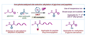 Utilizing iron-mediated ligand-to-metal charge transfer (LMCT) photocatalysis provides a sustainable platform for generating carbon-centered radicals. This study presents the use of abundant and inexpensive iron as a photocatalyst to easily activate aliphatic carboxylic acids, producing Csp3 radicals for site-selective C(sp3)–H alkylation of glycines and peptides. The method exhibits broad applicability, cost-effectiveness, and excellent tolerance to various functional groups. It is a flexible and efficient approach applicable to the synthesis of various unnatural α-amino acids and enables peptide drug bioconjugation. In addition to secondary and tertiary radicals, the iron-LMCT system enables access to primary radicals and the highly unstable methyl radical, derived from acetic acid, facilitating the production of methylated glycine derivatives. Preliminary mechanistic studies suggest a reaction pathway involving an Fe(III)–Fe(II)–Fe(III) redox cycle and radical–radical cross-coupling.