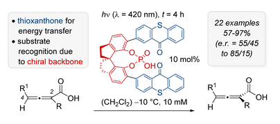 Stierle, Max; Bitterlich, Daniel; Westermayr, Julia; Bach, Thorsten: Photochemical deracemization of 2,3-allenoic acids mediated by a sensitizing chiral phosphoric acid catalyst. Chem. Sci. 16, 2025, 19711−19719.
