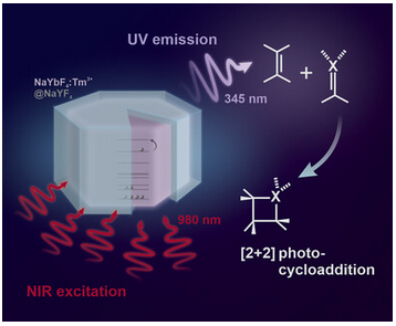 Biological photosynthesis harnesses energy from multiple photons to drive complex chemical transformations. In contrast, chemical photocatalysis typically relies on single-photon excitation, limiting its applicability in high-energy-demanding reactions. Upconversion nanoparticles (UCNPs), which can convert multiple low-energy near-infrared (NIR) photons into a single higher-energy photon, offer a promising solution. We synthesized and systematically improved NaYbF 4 :Tm@NaYF 4 nanoparticles, focusing on sensitizer concentration, dopant spacing, and shell thickness to enhance ultraviolet (UV) and blue emission. Compared to low doped NaYF4 :Yb, Tm systems, our nanoparticles exhibited significantly improved brightness, with a 210-fold enhancement in UV emission at 345 nm. Using these UCNPs as heterogeneous photocatalysts, we achieved efficient [2 + 2] photocycloadditions and Paternò–Büchi reactions under 980 nm excitation, with turnover numbers (TON) exceeding 290,000 and turnover frequencies (TOF) up to 8.52 s−1 . Additionally, the UCNP catalysts were readily recoverable. Our results provide a rational framework for tailoring UCNPs for energy-demanding photochemical reactions and establish their potential in synthetic and biomedical applications that require deep-tissue, low-phototoxicity excitation.