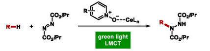 Pyridine N-oxides are reported as neutral ligands in cerium photocatalysis. By using those neutral ligands, photoactive Ce(IV)-species are generated, which show an extensive bathochromic shift compared to previously employed cerium-based complexes. This allows the effective utilization of green light in the redox-neutral CH-hydrazination of small molecules under very mild photocatalytic conditions.
