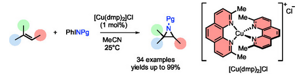 The direct aziridination of alkenes using iminoiodinanes as nitrogen source was successfully achieved by applying the copper(I) complex [Cu(dmp)2]Cl (dmp = 2,9-dimethyl-1,10-phenanthroline), being an established photocatalyst. The copper complex exhibits high activity in the dark for aziridination, complementing recently reported photoredox-catalyzed aziridinations with Ru(bpy)3Cl2, which enables the transformation to occur at room temperature with low catalyst loading (1 mol%) and short reaction times (down to 10 minutes). Notably, the aziridine derived from α-methyl styrene undergoes visible-light-driven, copper-catalyzed ATRA (atom transfer radical addition) to yield functionalized amines, highlighting the dual role of [Cu(dmp)2]Cl as both aziridination and photoredox catalyst for streamlined synthesis to complex nitrogen-containing scaffolds.