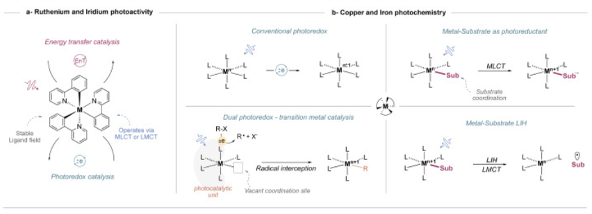 Shifting from rare and precious metal catalysts in photochemical systems, such as ruthenium and iridium, to abundant and sustainable ones is still challenging. Copper and iron are fascinating, given their relative abundance and economic advantage. While the conception of copper and iron luminophores for the application in catalysis is faced with the undesirable rapid deactivation of photoactive states, making intermolecular redox exchange inefficient, the harnessing of copper and iron’s propensity to perform fast ligand exchange and accommodate radical intermediates enabled their successful implementation in photocatalysis. This review underscores the rapid growth of copper and iron in photocatalysis as green and sustainable alternatives, highlighting the unique catalytic features they offer.
