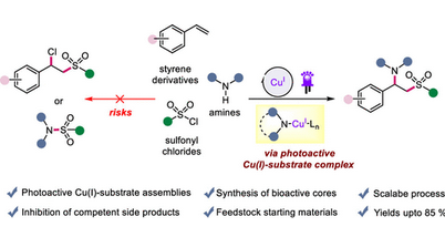 We report a Cu(I)-photocatalyzed three-component coupling process to achieve the regioselective, vicinal 1,2-aminosulfonylations of alkenes. The critical aspect of this methodology is found in the utilization of in situ generated photoactive Cu(I)-amine substrate complexes, which facilitate the formal oxidation of Cu(I) to Cu(III) in a stepwise manner. In this way, the conceivable two-component chlorosulfonylation of alkenes is effectively suppressed, allowing the combination of styrene derivatives, sulfonyl chlorides, and amines. Furthermore, this protocol can facilitate late-stage functionalization, thereby enabling the diversification of biomolecules.